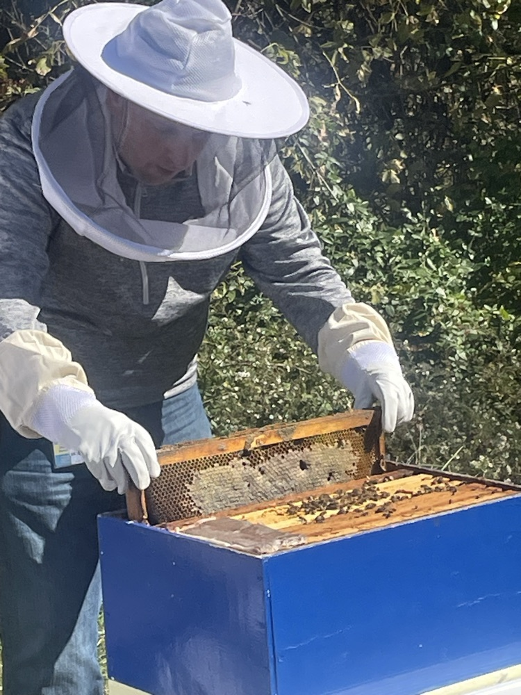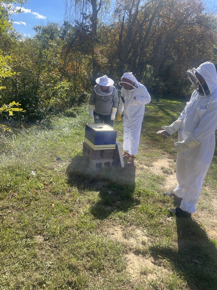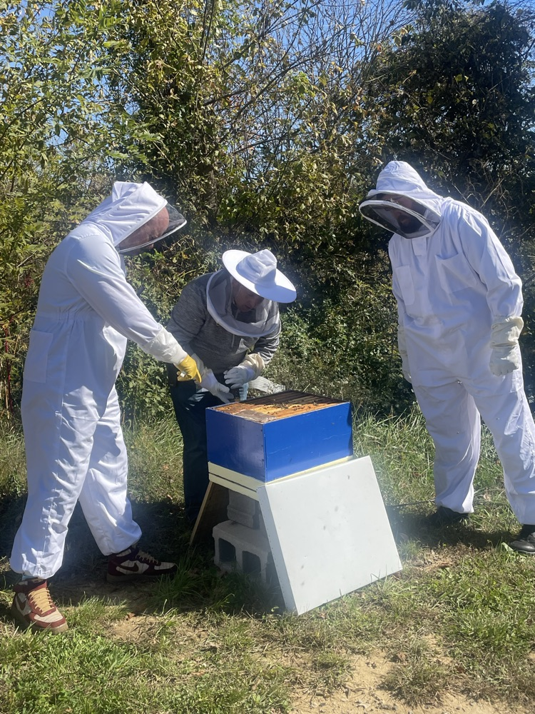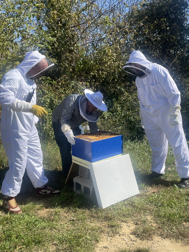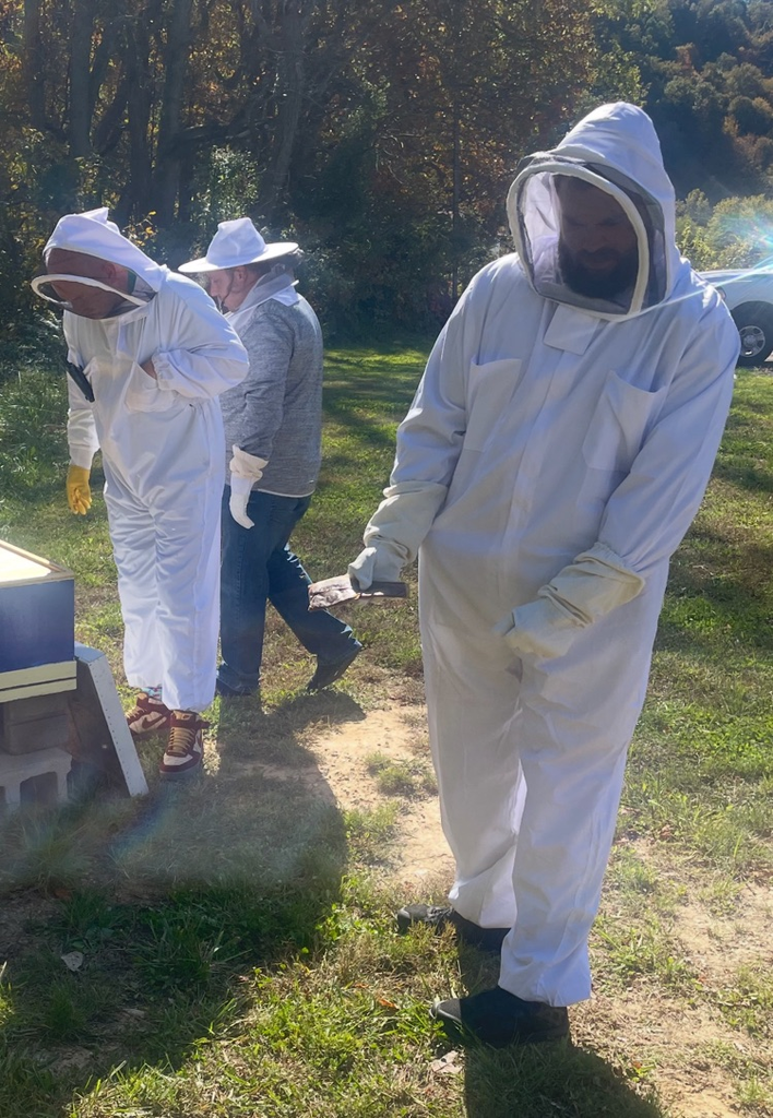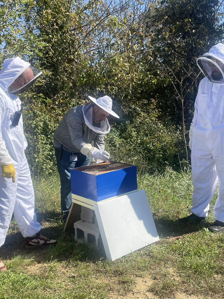 With the help and guidance of Mrs Coleman, Officer Robinson, Mr. Smith and Mr. Ward take on bee keeping!